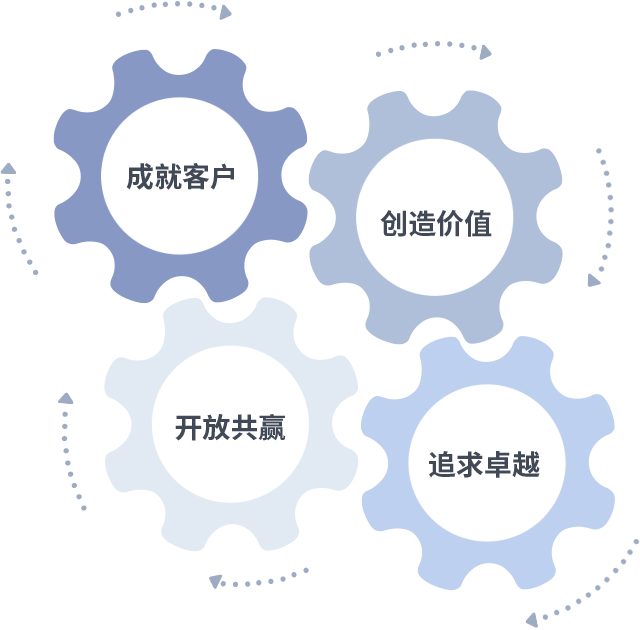 成就客户是一切决策的出发点,,,,创造价值是衡量所有工作的标准,,追求卓越是我们做事做人的态度,,开放共赢是我们的格局也是最终的结果。。价值观的齿轮环环相扣,,推动着组织里的每个人不断向前。。。